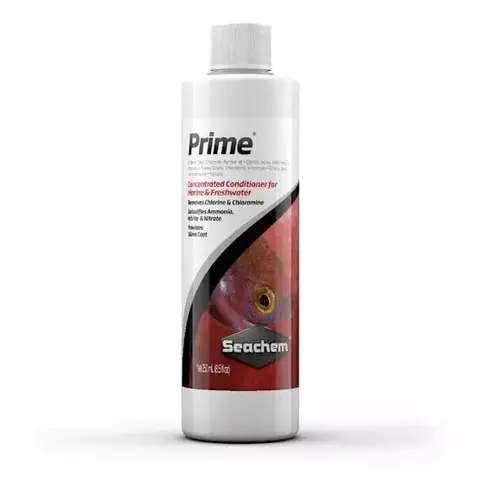 Seachem Prime é utilizado para o tratamento de água, auxiliando na desintoxicação completa dos metais pesados e tóxicos encontrados na água da torneira. Prime é um condicionador completo e concentrado para água doce e salgada. Remove cloro, cloramina e neutraliza amônia, convertendo a amônia em uma forma segura e não tóxica que facilmente é removida pelo biofiltro do aquário. O condicionador pode ser utilizado durante a ciclagem para aliviar a toxicidade de amônia/nitrito. Ele também irá desintoxicar todos os metais pesados encontrados na água da torneira em níveis de concentração típicos. Prime não é ácido e não impactará o pH, nem irá sobrecarregar o skimmer. Use no início do aquário e sempre quando for repor a água do seu aquário.